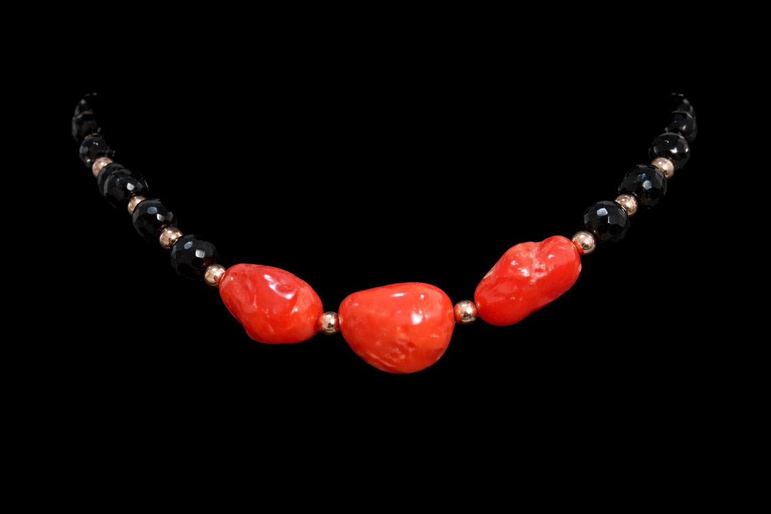 La collana è composta da corallo rosso e tormalina nera, la chiusura è di argento 925/1000